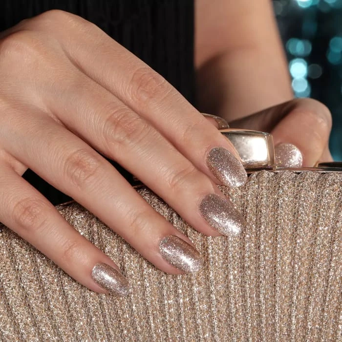 Enhance your look with this light pink golden glittery gel polish and make a real statement. Achieve a glamorous, salon-quality finish that will turn heads and keep you shining for up to 21 days – with no chipping.