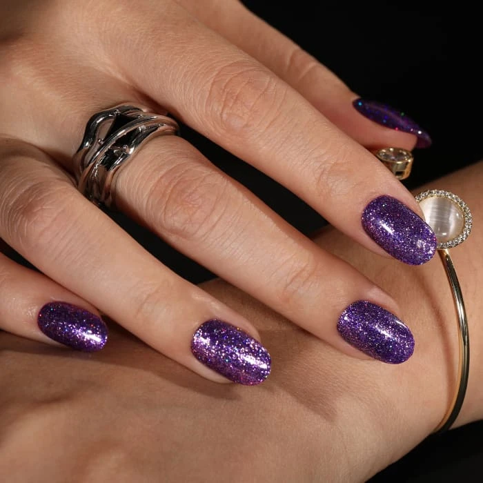 Life’s too short to blend in. Step out of the shadows and into the spotlight with this stunning purple glitter to rock the world. Be part of the trendsetting crowd, and show off elegant nails that last for days.