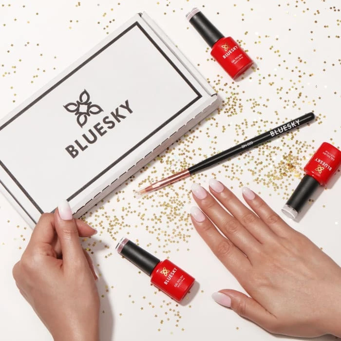 2. Apply a thin layer Bluesky Base Coat, avoiding your skin and cuticle, and cure for 60 seconds in your Bluesky lamp.