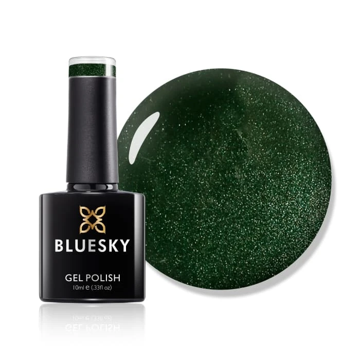 This deep pine green gel polish is finished with a touch of glitter for an elegant sparkle.