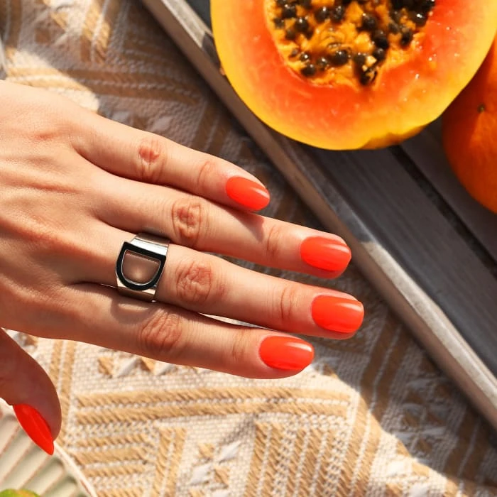 We’ve mixed orange and red hues to create this striking neon gel polish.