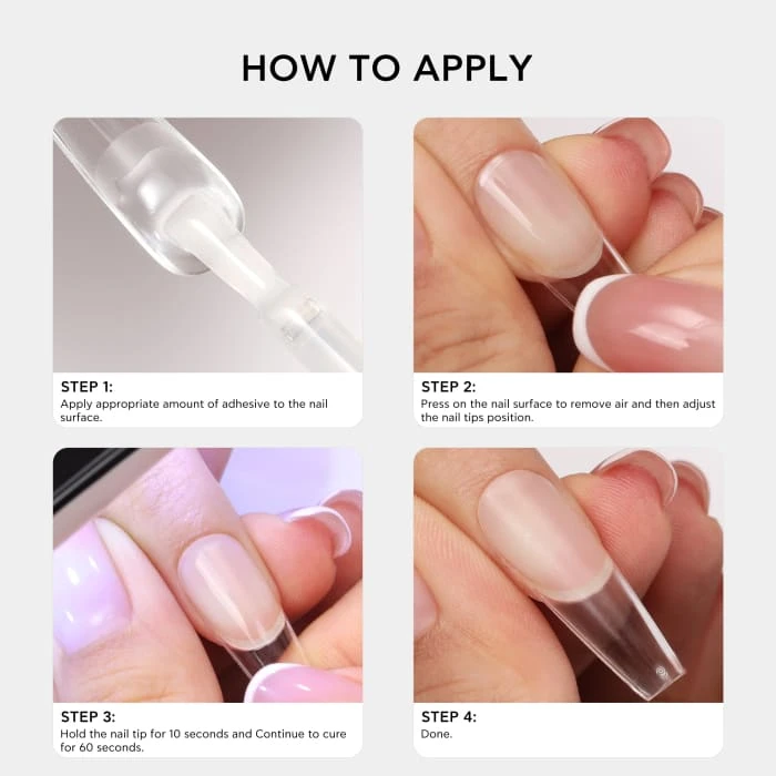 - Apply a thin, even layer of Bluesky Strong Adhesive to the inside of the Bluesky Gel Tip. Press the tip onto the nail bed, starting at the cuticle, and ensure there are no air bubbles. Hold the tip in place and cure for 15 seconds. Release the tip and cure for an additional 45 seconds.