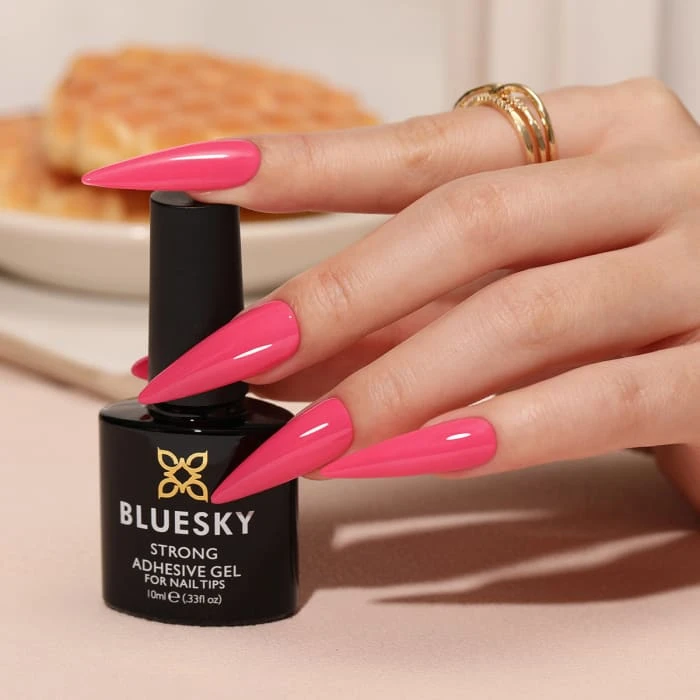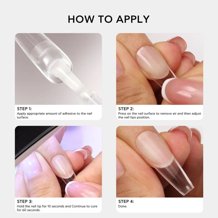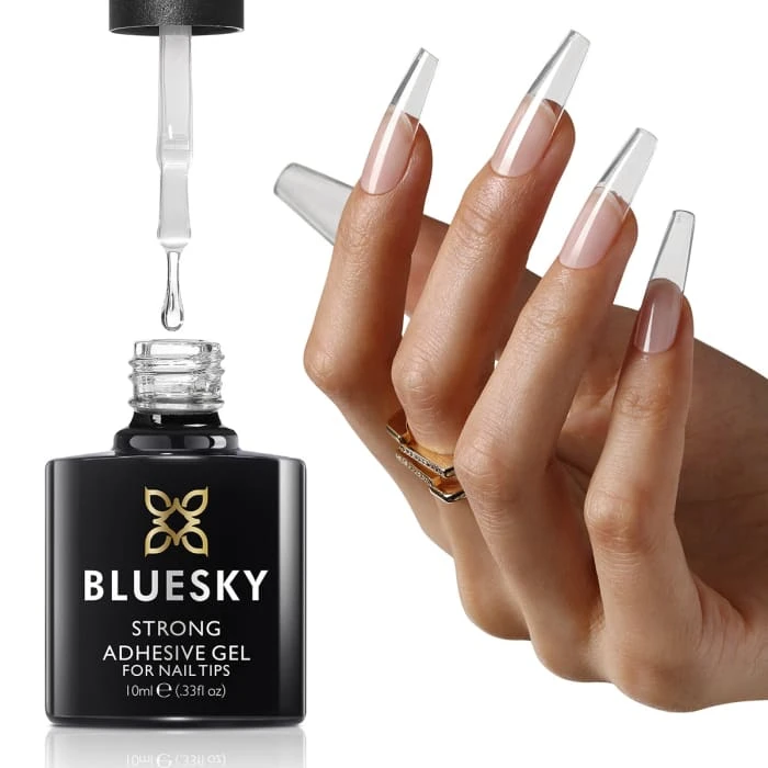 A strong, long lasting, clear nail adhesive for use with all types of nail tips including Soft gel tips and acrylic tips