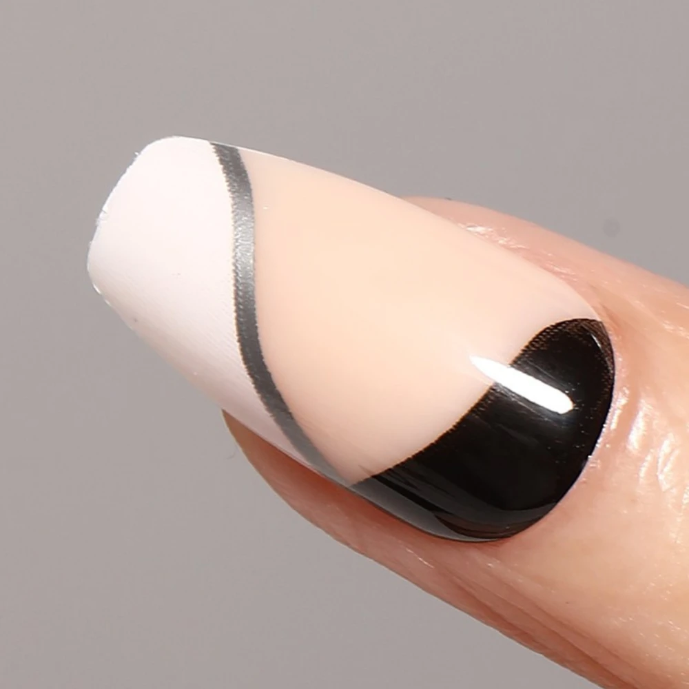 Elevate your style with our Press On Nail Set – Monochrome. Featuring 24 nail tips with a sleek black, white and nude geometric design, with silver metallic detailing, these press on nails bring a modern, chic vibe to your look. The durable, lightweight design ensures a comfortable fit, while their easy removal makes switching up your style a breeze. For bold, trend-setting nails without the hassle, this set is your go-to choice!