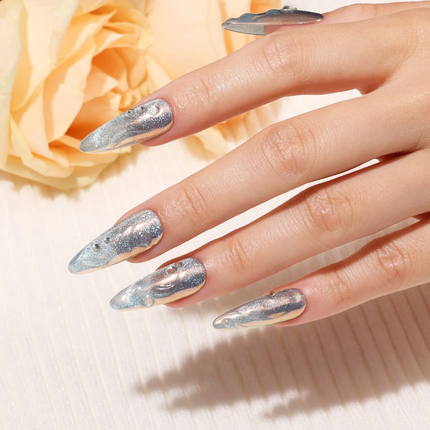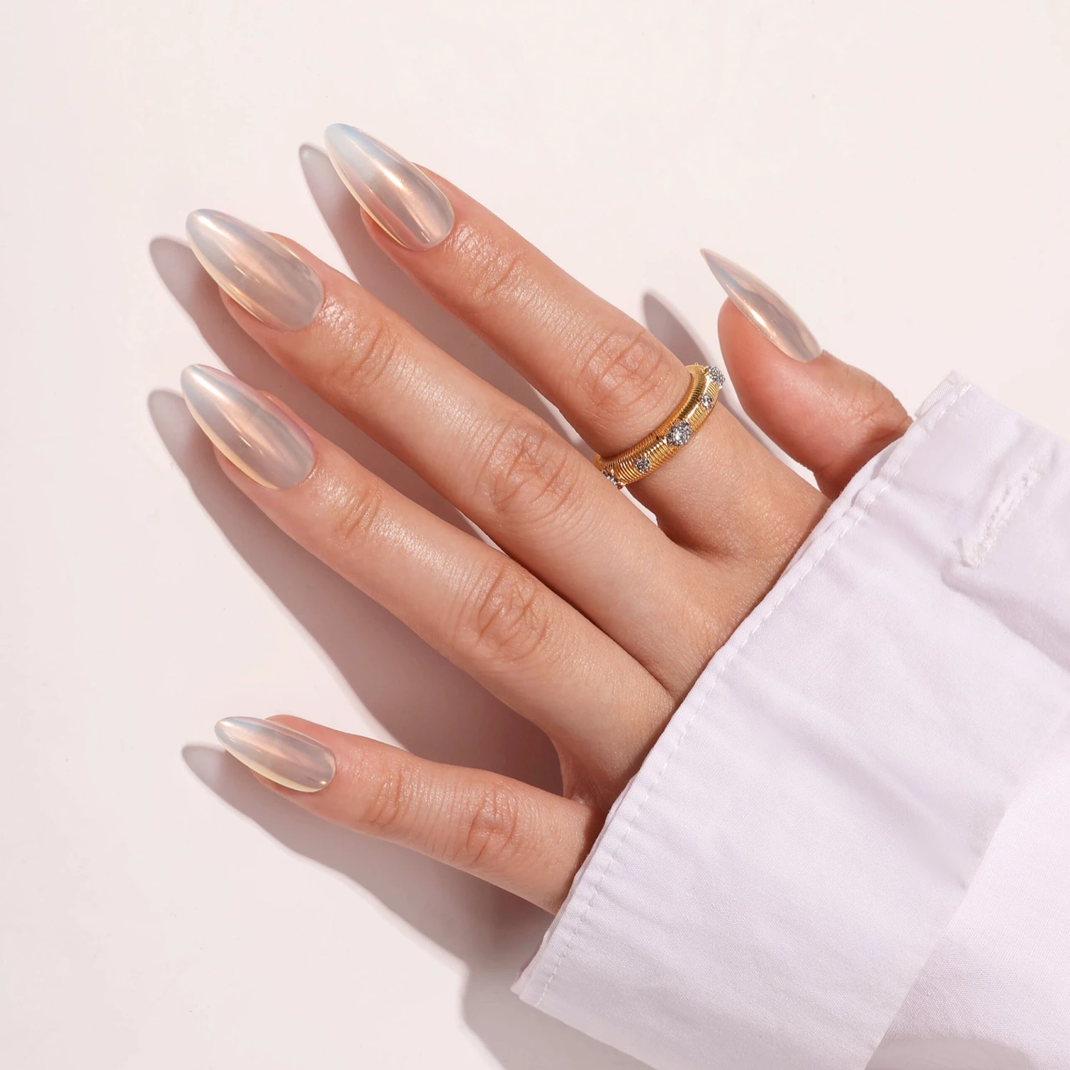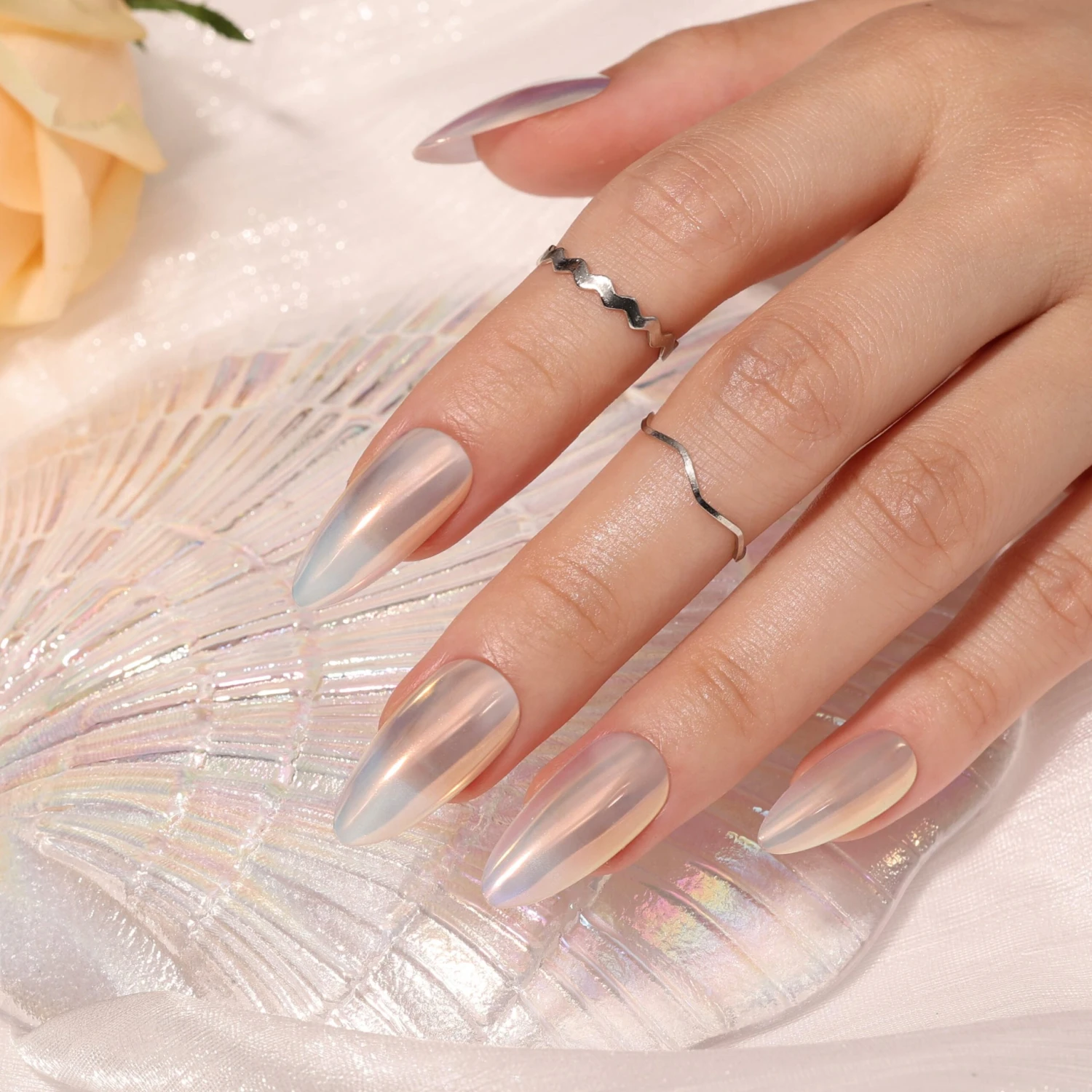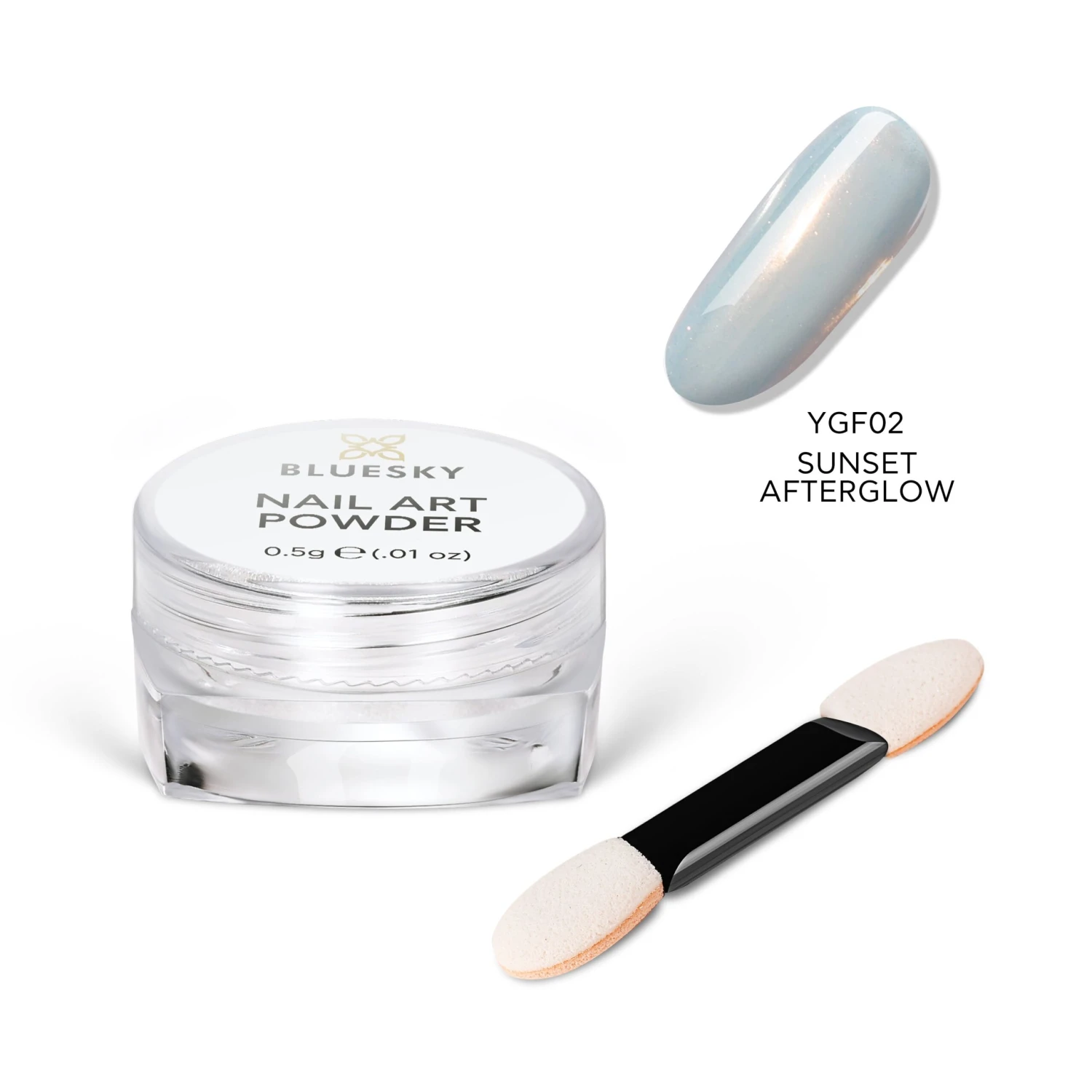 The stunning Sunset Afterglow Nail Art Powder features a cool light blue base layered with a soft orange glow, visible through the transparent nail surface for a captivating effect. Pair it with a light gel polish to achieve a dreamy, aurora-like finish, evoking the enchanting beauty of moonlit nights.
